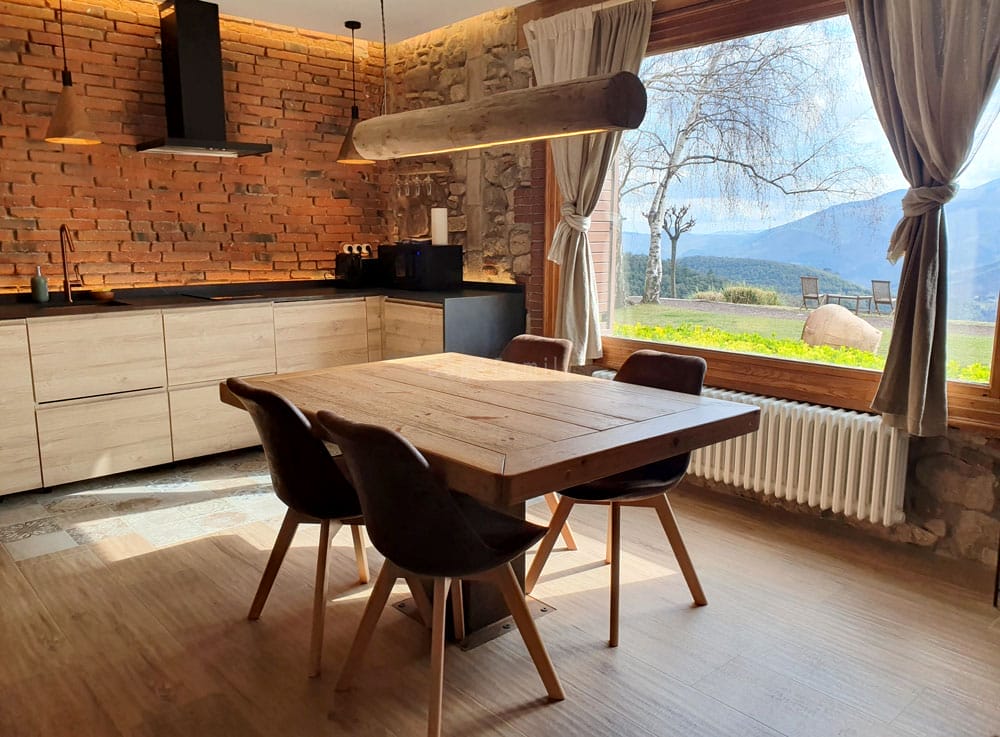 Mas Can Ferrer también dispone de un espacio interior, acristalado, con una gran mesa y cocina para celebraciones o preparar barbacoas cuando hace mal tiempo o frío. Los huéspedes pueden utilizar el espacio si se encarga previamente.