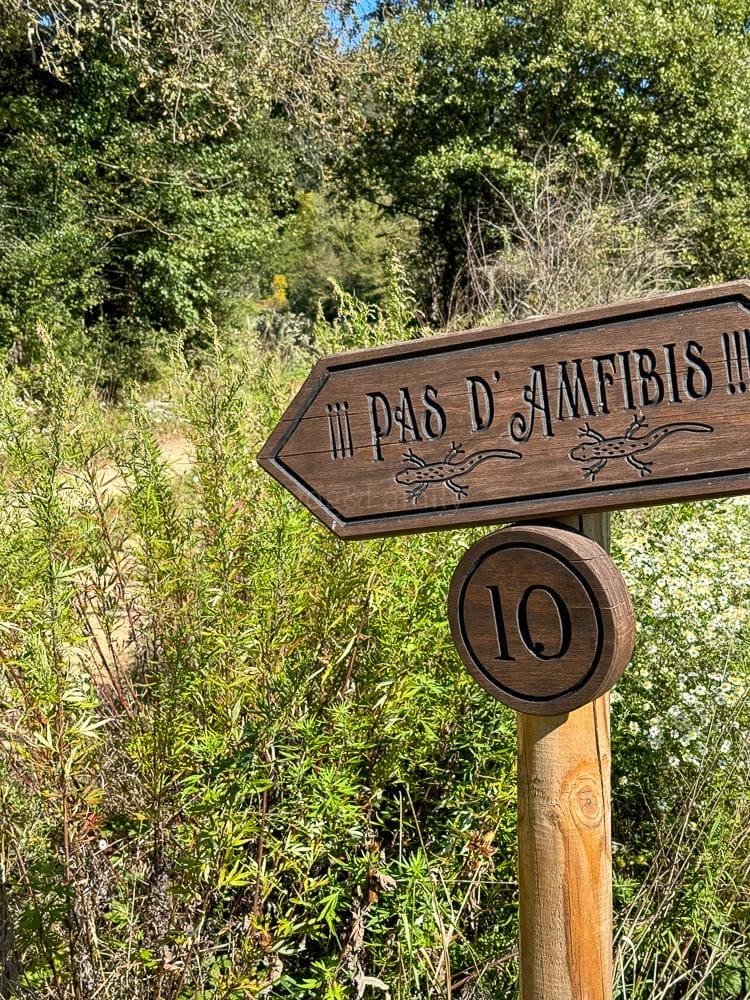 Varios carteles nos explican, de forma simpática, que los animales, desde los más grandes (corzos, zorros…) hasta los más diminutos (como pequeños insectos) tienen un espacio seguro en Mas Campassol. Como una curiosa construcción de madera que encontrarás en la habitación en la que se te invita, si te encuentras algún insecto a liberarlo al exterior. También los animales de la Fundació Empatia disfrutan aquí de una tranquila segunda oportunidad. Por el bienestar físico y psíquico de estos animales rescatados que han sufrido estrés y maltrato se pide que los perros vayan atados en las zonas más cercanas a la casa. Las 43 hectáreas son, además, zona no cinegética (está prohibida la caza)