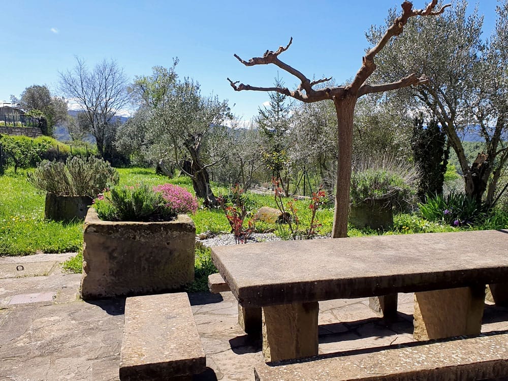 Un dels atractius de Casa Coronas és, sens dubte, el seu ampli jardí tancat, ideal si vas amb gos, per no haverte de preocupar de si s’escapa. El jardí, dús compartit per als tres apartaments, té una zona amb una taula de pedra i bancs i també barbacoa, que pot utilitzar-se si es reserva prèviament. La resta és un gran prat, amb oliveres i flors. Tot l’espai queda tancat amb una reixa metàl·lica.