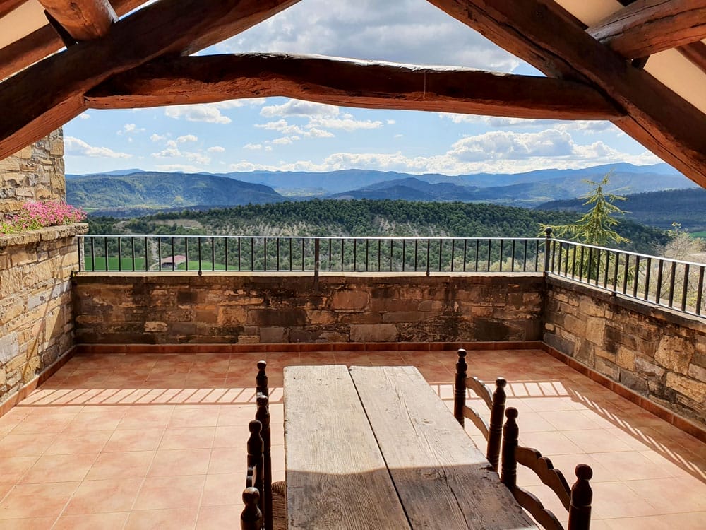L’apartament més gran és el Mirador, amb 85m2. Destaca per l’esplèndida terrassa cuberta amb una taula i cadires, amb vistes a la vall del Cinca on podem contemplar, ben dimintuta però no gaire lluny, la vila medieval d’Ainsa. És un dúplex, a la planta baixa hi trobem un ampli saló amb llar de foc i un menjador amb una cuina completament equipada, amb nevera, vitroceràmica, forn, microones, cafetera, torradora…