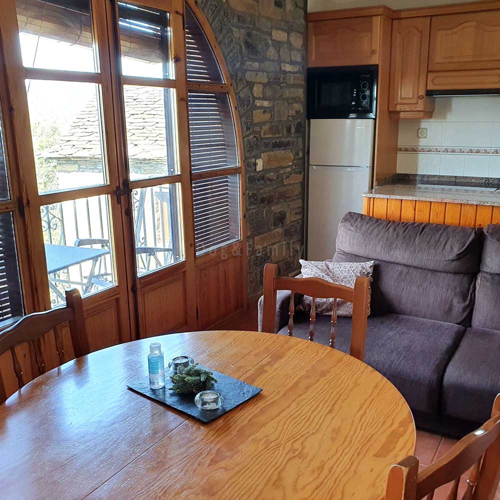 La seva propietària actual, la Maria Ángeles, filla i descendent de la casa contribueix a que la teva estada sigui completament confortable. Ella viu amb la seva família en el mateix edici però amb entrada independent, al costat. Saps que si necessites alguna cosa, ella està a prop però mantens la teva indepencència. En arribar, et pots trobar a la cuina uns deliciosos roscos fets per ella mateixa si és Setmana Santa, amb ous de les seves gallines, amb un vi o una cervesa artesana de la zona… És la millor targeta de presentació, per començar a estimar la casa i assaborir la comarca des de que hi entres. Després de varios dies descobrint el Sobrarbe des d’aquests còmodes apartaments, no pots desitjar una altre cosa que tornar-hi ben aviat!