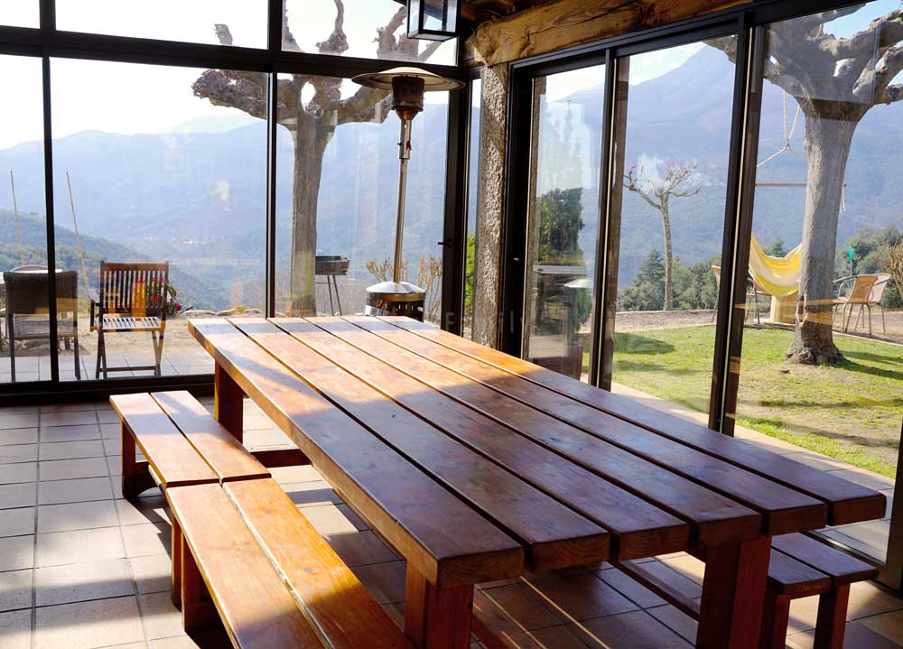 Mas Can Ferrer també disposa d’un espai interior, envidrat, amb una gran taula i cuina per a celebracions o preparar barbacoes quan fa mal temps o fa fred. Els hostes poden utilitzar l’espai si s’encarrega prèviament.