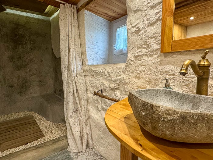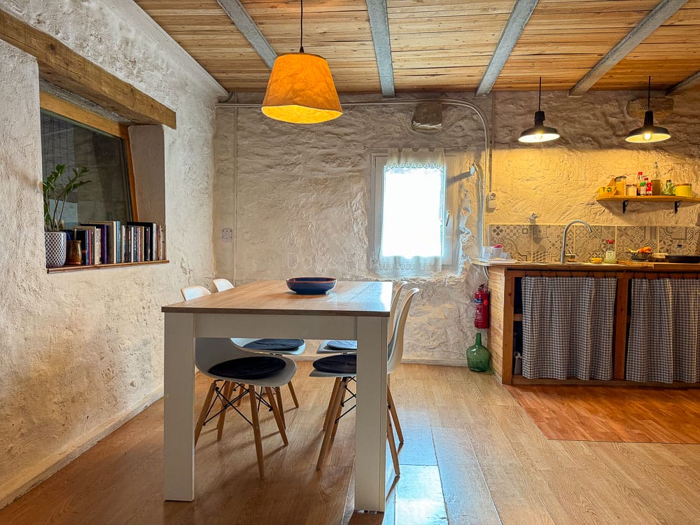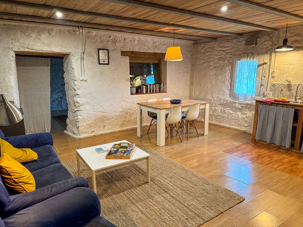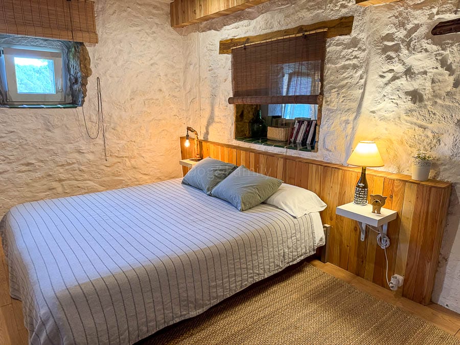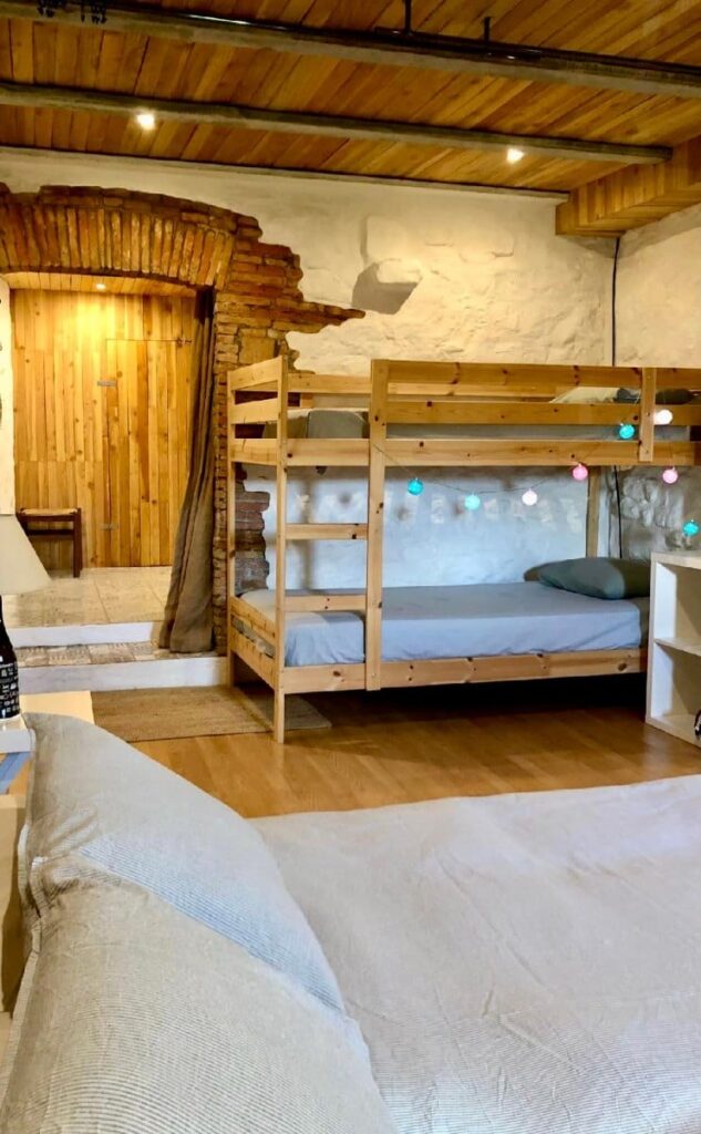 El apartamento se halla en la planta baja de la masía, con entrada directa desde el jardín. Consta de un espacio abierto en el que se ubica una sala de estar con chimenea, sofás, un comedor y una cocina con equipamiento básico. Al lado encontramos una habitación con una cama doble, dos literas y un baño con un espacio de ducha muy natural, creado sobre piedras y madera . Todos los espacios quedan abiertos, lo que resulta práctico y dan sensación de amplitud.