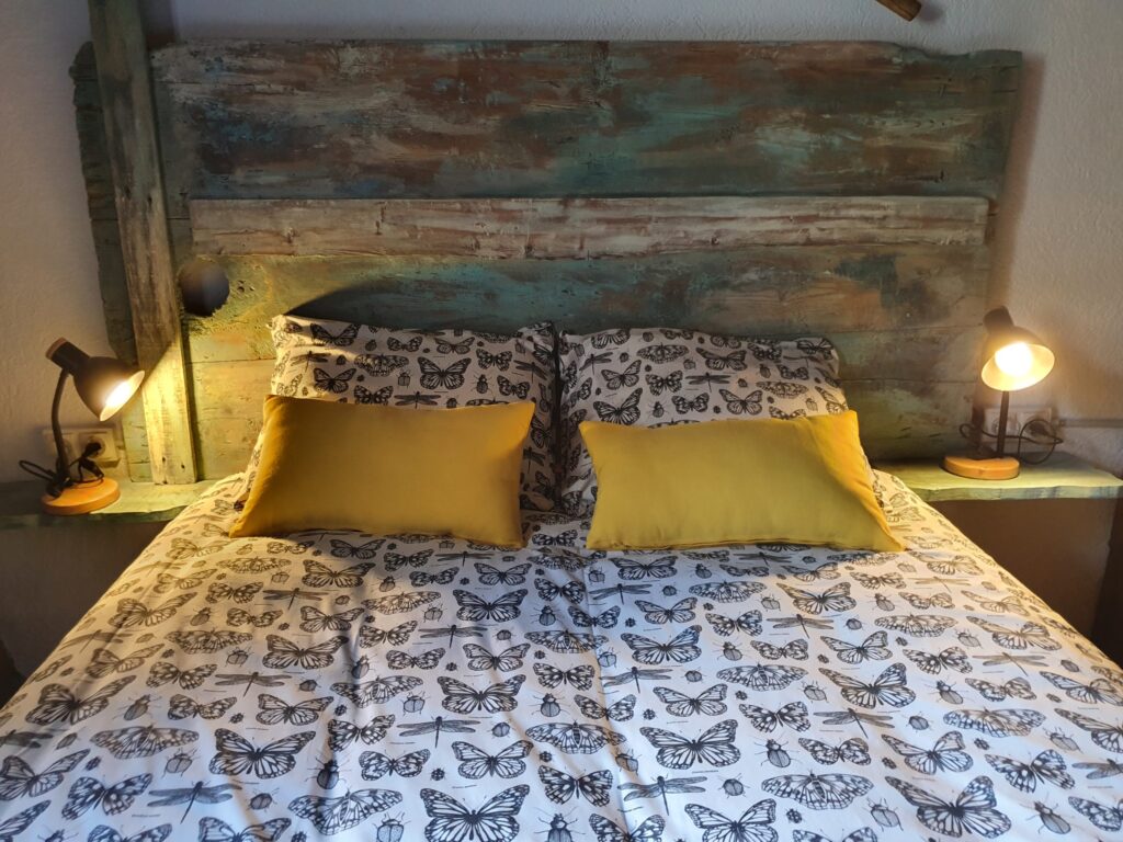 Los muebles han sido reciclados por la madre de Arian y resultan muy modernos y originales; marcos, tablas de madera rústicas, antiguas puertas convertidas en cabezales de cama…